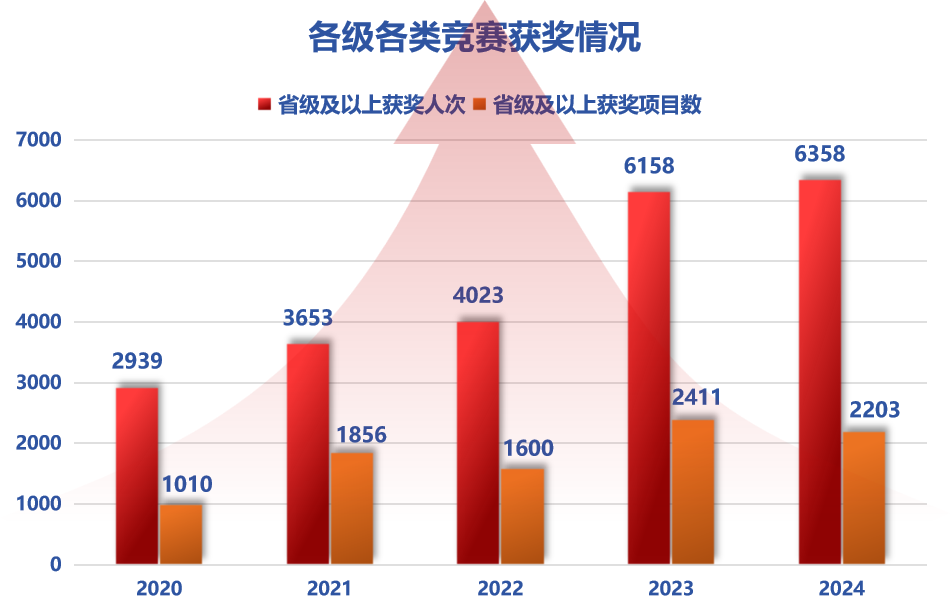 校團委聚焦科技育人成效,厚植科技創新人才培養基礎,構建了“競賽驅動、實踐導向、項目培育、成果轉化”的科技創新育人體系,為學校國家“雙一流”建設和改革發展提供有力支撐。近五年,學校各級各類競賽參賽人次累計達17.7萬,年均增長率12.4%;省級及以上獲獎人次達2.7萬,年均增長率11.9%;省級及以上獲獎項目數逾9000項,年均增長率28%。
