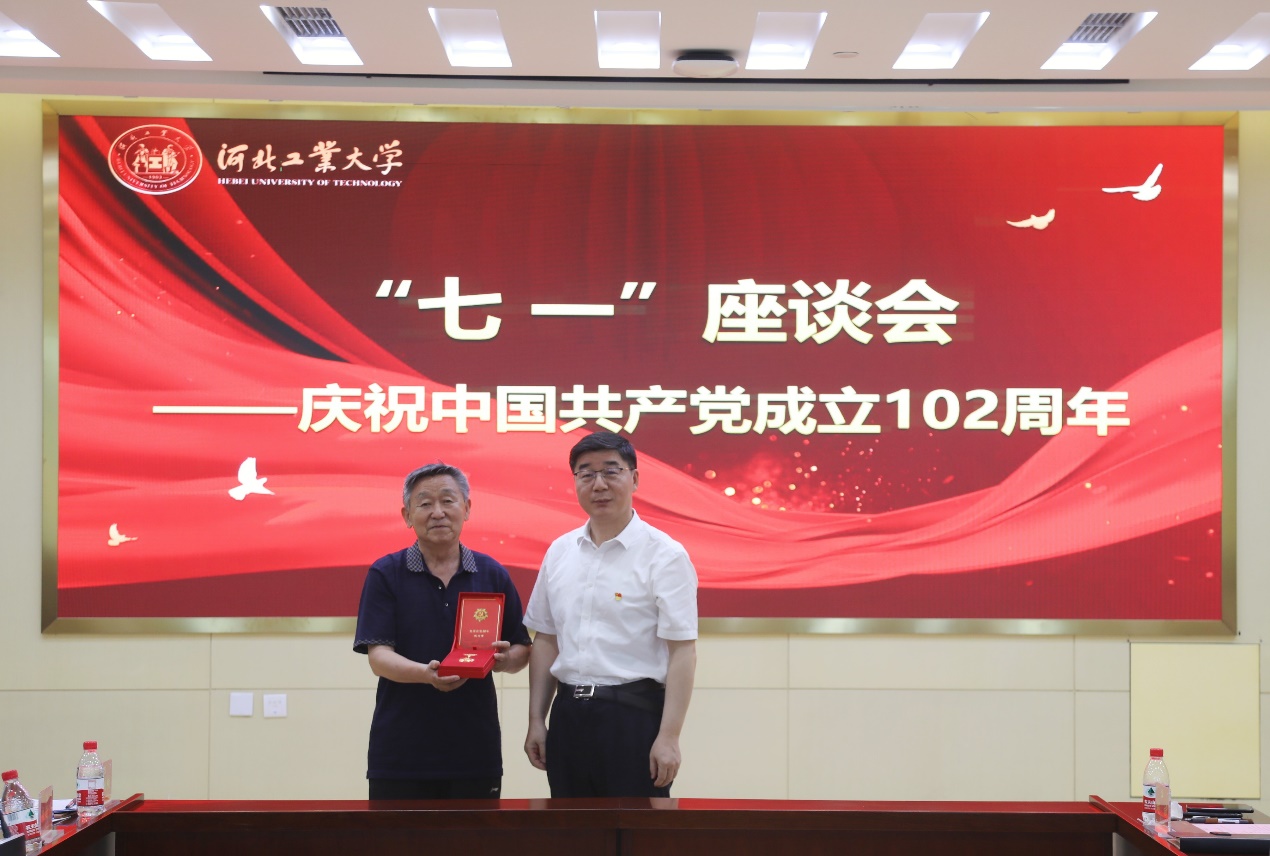 校黨委書記韓旭為“光榮在黨50年”黨員代表蓋建國同志頒發(fā)紀念章。學(xué)校黨員校領(lǐng)導(dǎo)、黨委部門負責同志、二級黨組織書記、師生代表參加座談會。座談會由校黨委副書記張建暢主持。