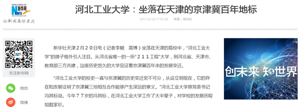 2月20日,新華社發布電文《河北工業大學:坐落在天津的京津冀百年地標》,報道了我校由1903年創辦的北洋工藝學堂,成長為河北省唯一的“211工程”大學,再到步入河北省、天津市、教育部三方共建的世紀歷程,講述了一所百年高校與京津冀歷史變遷密不可分的地緣血脈,點明了在京津冀協同發展國家戰略的時代背景下,一所“地標”學府所應有的擔當和使命!