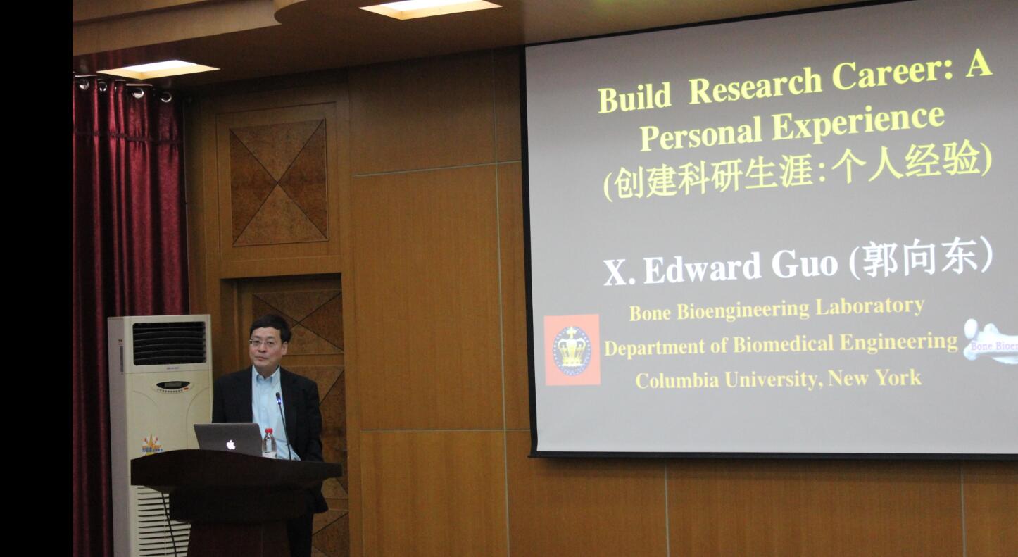 郭向東教授在骨生物力學、骨對力學荷載的適應及其細胞/分子機制、生物組織的計算模型、細胞生物力學、骨微結構的影像學分析、細胞微觀影像等領域有眾多突出研究成果。曾擔任美國力學工程師協會固體力學專業委員會副主席,生物醫學生理調節協會主席,國際華人骨研究會主席等職位。榮獲美國國家健康學會的國家研究貢獻獎、美國國家自然基金事業獎以及2007年中國海外杰出青年獎。主要學術兼職有美國國家生物力學委員會委員,美國骨外科研究協會董事會董事、世界生物力學委員會會員,美國醫學及生物工程學院會士,美國醫學及生物工程學院董事會董事等。此次郭向東教授及其一行與我校生物物理研究所就開展合作達成了初步意向。