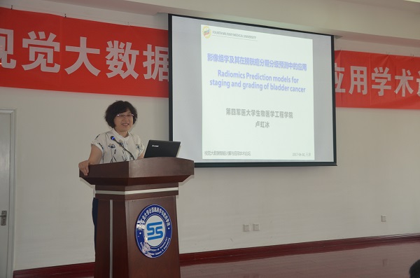 開篇是由第四軍醫(yī)大學(xué)盧虹冰教授做了題為“Radiomic prediction model for muscle invasiveness and grading of bladder cancer”的報(bào)告。報(bào)告介紹了醫(yī)學(xué)影像組學(xué)(Radiomic)的內(nèi)涵和發(fā)展歷史,指出醫(yī)學(xué)影像組學(xué)是視覺大數(shù)據(jù)在醫(yī)學(xué)診斷中的重要應(yīng)用,并以膀胱癌的分級(jí)診療為例,介紹了基于影像組學(xué)的主要任務(wù)和相關(guān)成果,包括膀胱內(nèi)外壁的分割方法,腫瘤區(qū)域特征提取方法,多模態(tài)影像融合方法和基于SVM等的分類方法,并講解了基于醫(yī)學(xué)影像組學(xué)的癌癥輔助診斷,指出基于影像組學(xué)和深度學(xué)習(xí)的人工智能系統(tǒng)對(duì)提高診斷效率,減輕醫(yī)生負(fù)擔(dān),造福病患具有重大的科學(xué)意義和臨床價(jià)值。