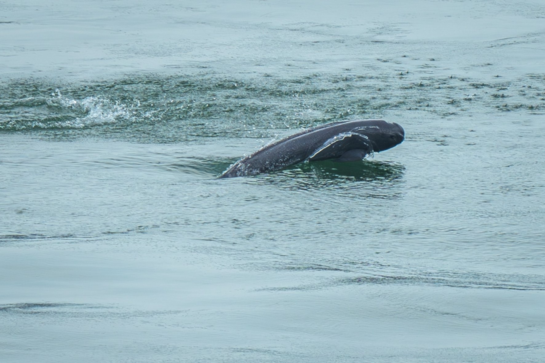 長江江豚在湖北省宜昌市葛洲壩下游水域逐浪嬉戲(2024年5月21日攝)。新華社記者 肖藝九 攝