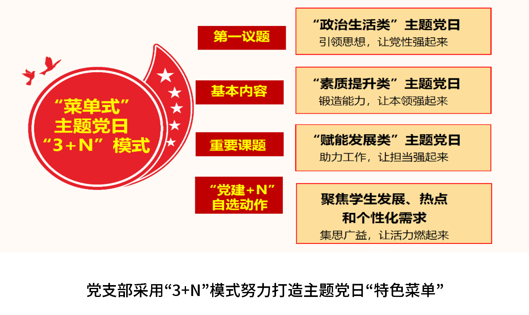 黨支部堅決貫徹“哪里有黨的基層組織,哪里就有健全的組織生活和黨組織作用的充分發揮”要求,以“菜單式”主題黨日為載體,不斷強化黨員教育、規范組織生活、提升組織活力,為青年大學生擎旗致遠、領航定向。