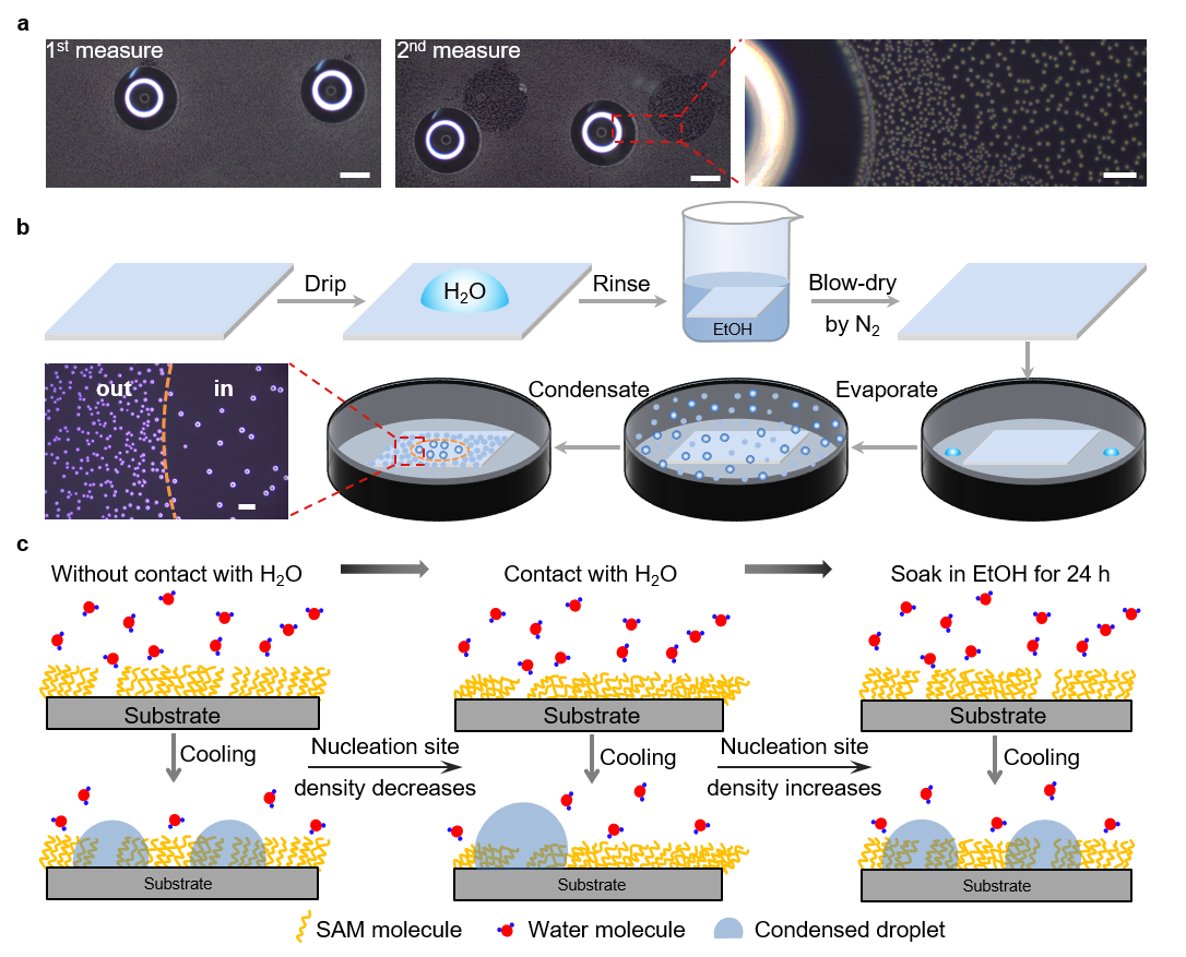 故事開始于大約七年前的一天,當(dāng)時(shí)的白國(guó)英還是博士研究生,在做冰成核溫度的測(cè)量(一個(gè)通過(guò)光學(xué)顯微鏡觀察表面上水滴在降溫過(guò)程中凍結(jié)過(guò)程的實(shí)驗(yàn),如有興趣,請(qǐng)參閱“Nature 2019, 576,437-441”了解更多細(xì)節(jié))時(shí),發(fā)現(xiàn)再次測(cè)量之前測(cè)試過(guò)冰成核溫度的表面時(shí),上一次測(cè)試中的水滴痕跡以一種獨(dú)特的冷凝水滴圖案顯示出來(lái)(圖a)。白國(guó)英說(shuō)道,“雖然該現(xiàn)象看起來(lái)很有趣,但因?yàn)楫?dāng)時(shí)的博士課題就將其暫且擱置了,直到2020年,我的學(xué)生再次觀察到這一現(xiàn)象,我才把它撿起來(lái),進(jìn)行了系統(tǒng)的研究”。