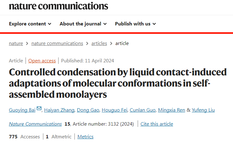 4月11日,河北工業(yè)大學(xué)材料學(xué)院白國(guó)英教授課題組在Nature Communications上發(fā)表題為“Controlled condensation by liquid contact-induced adaptations of molecular conformations in self-assembled monolayers”的高水平論文,并被刊登在Nature Communications編輯精選網(wǎng)頁(yè)(展示某一領(lǐng)域最近發(fā)表的50篇最好論文)上。河北工業(yè)大學(xué)材料科學(xué)與工程學(xué)院天津市層狀復(fù)合與界面控制技術(shù)重點(diǎn)實(shí)驗(yàn)室為第一完成單位。