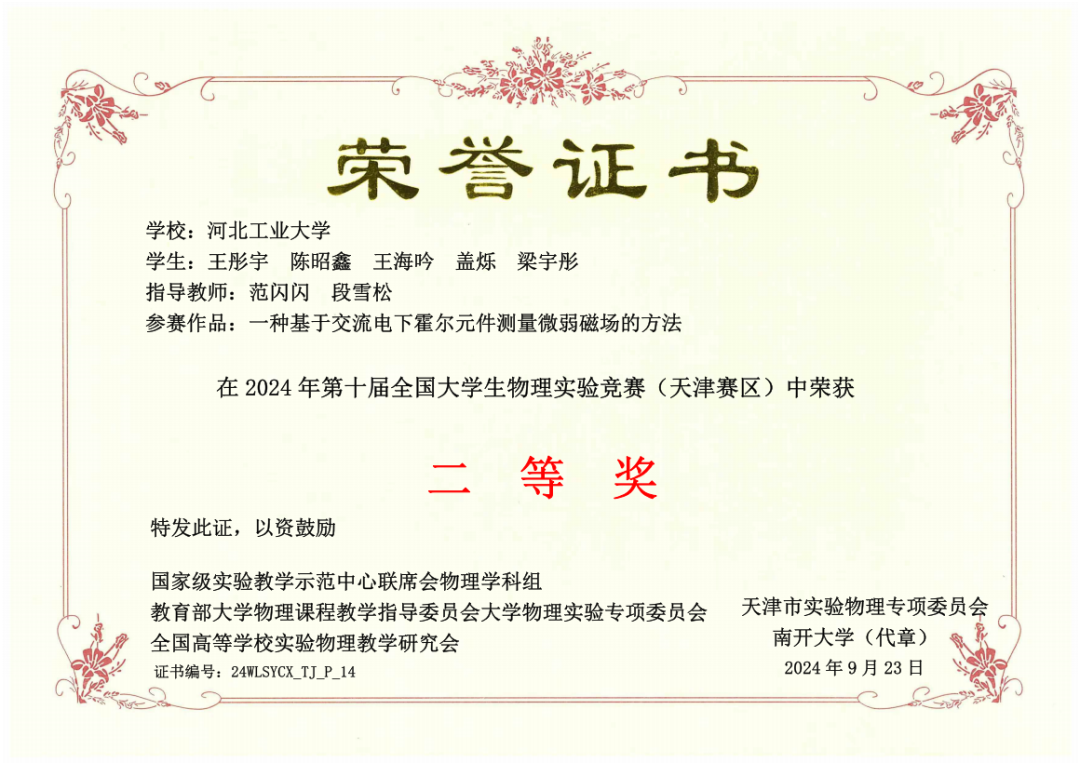 理學(xué)院學(xué)生獲第十屆全國(guó)大學(xué)生物理競(jìng)賽(天津賽區(qū))二等獎(jiǎng)