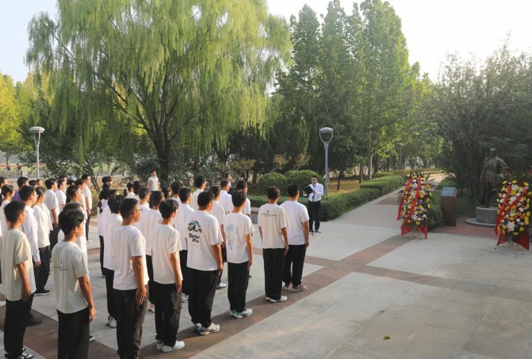 在抗日英烈雕塑前,師生代表奏唱國(guó)歌,對(duì)英魂致以崇高敬意。藍(lán)天國(guó)旗護(hù)衛(wèi)隊(duì)向烈士敬獻(xiàn)花籃。