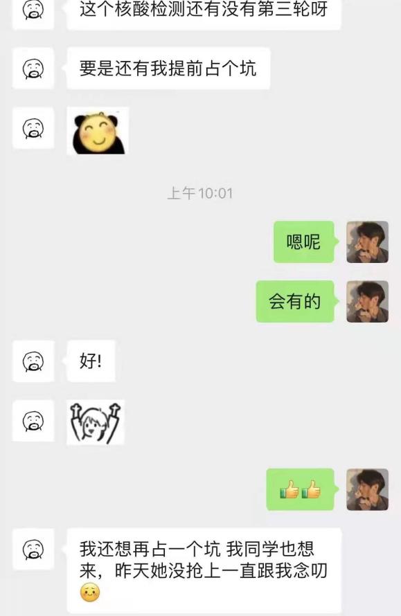 “這個核酸檢測還有沒有第三輪呀?要是還有我提前占個坑。”