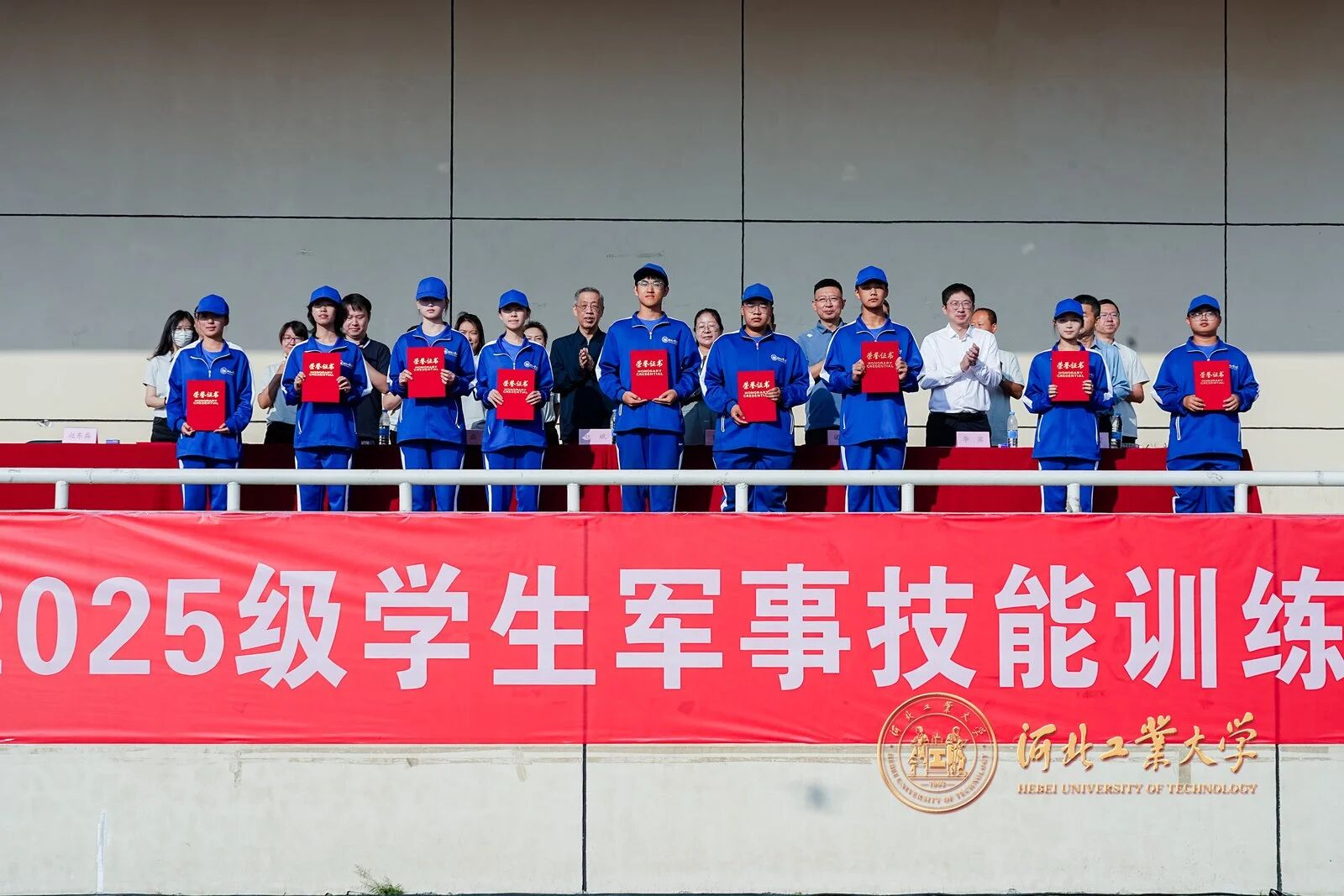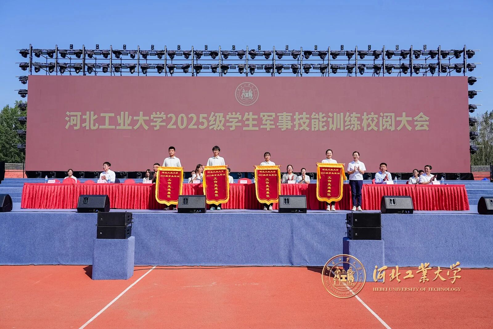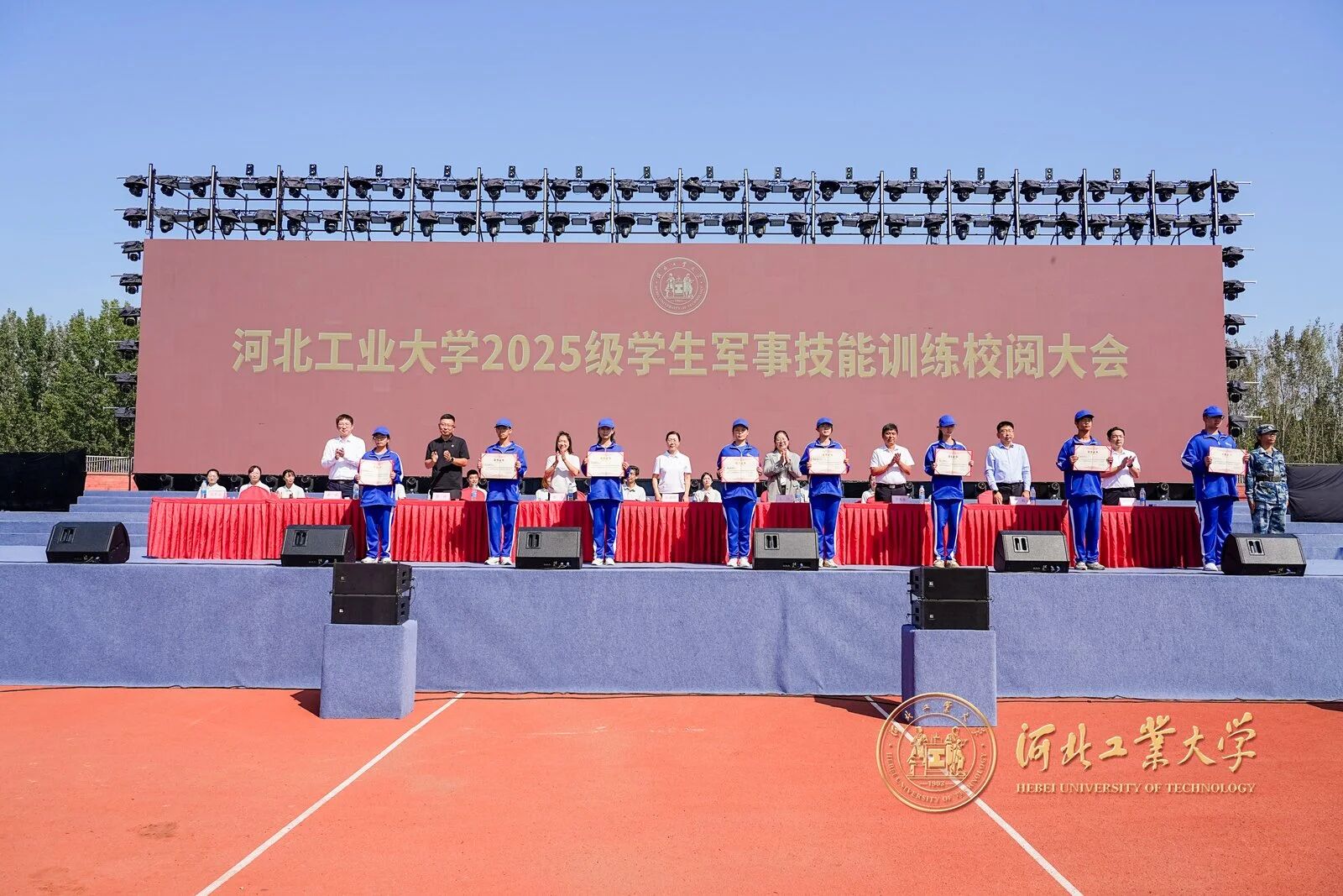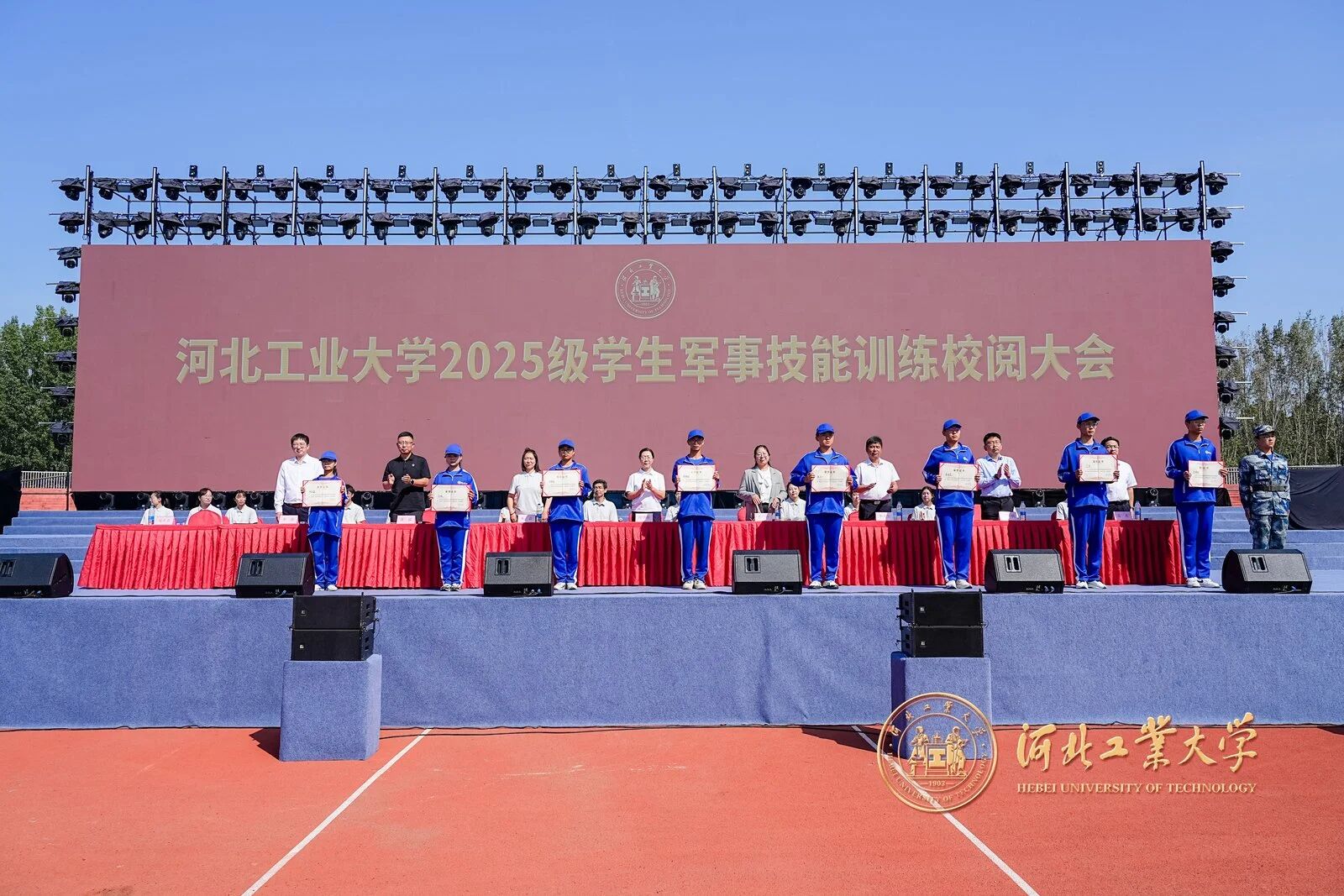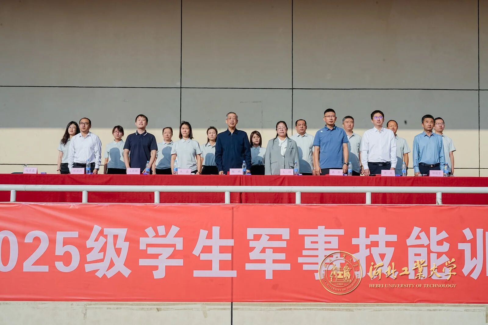 風拂征衣秋意爽,軍姿如柏氣軒昂。9月20日上午,河北工業大學2025級學生軍事技能訓練校閱大會在紅橋校區東院操場與北辰校區體育中心相繼舉行。校黨委副書記趙斌,校黨委常委、副校長陳鴻雁出席大會。校內各單位、部門負責同志,各學院軍訓工作領導小組負責人、承訓教官、2025級學生輔導員和2025級全體本科生參加大會。