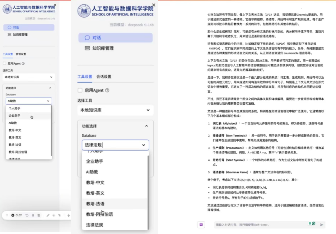 AI助力智能個(gè)人助理,提升學(xué)習(xí)與工作效率:學(xué)院針對(duì)教師和學(xué)生的需求,基于DeepSeek系列模型開(kāi)發(fā)了智能個(gè)人助理系統(tǒng)。該系統(tǒng)通過(guò)構(gòu)建專屬的課程知識(shí)庫(kù),教師服務(wù)端為教師提供個(gè)性化教學(xué)支持,學(xué)生服務(wù)端為學(xué)生提供定制化學(xué)習(xí)資源。AI助理能夠智能推薦學(xué)習(xí)內(nèi)容、分析學(xué)習(xí)進(jìn)度、解答學(xué)術(shù)問(wèn)題,極大提高了教學(xué)和學(xué)習(xí)效率。借助AI技術(shù)的輔助,教師能夠更好地掌控課堂節(jié)奏,學(xué)生也能享受更加高效和個(gè)性化的學(xué)習(xí)體驗(yàn),進(jìn)一步推動(dòng)教育質(zhì)量的提升。