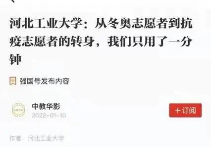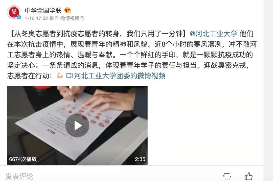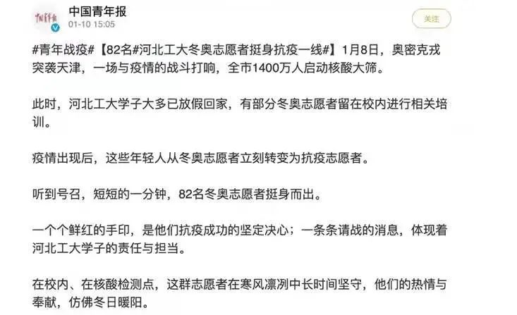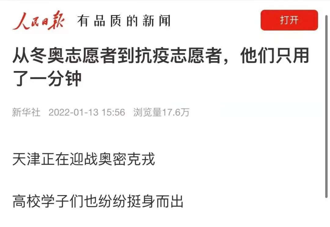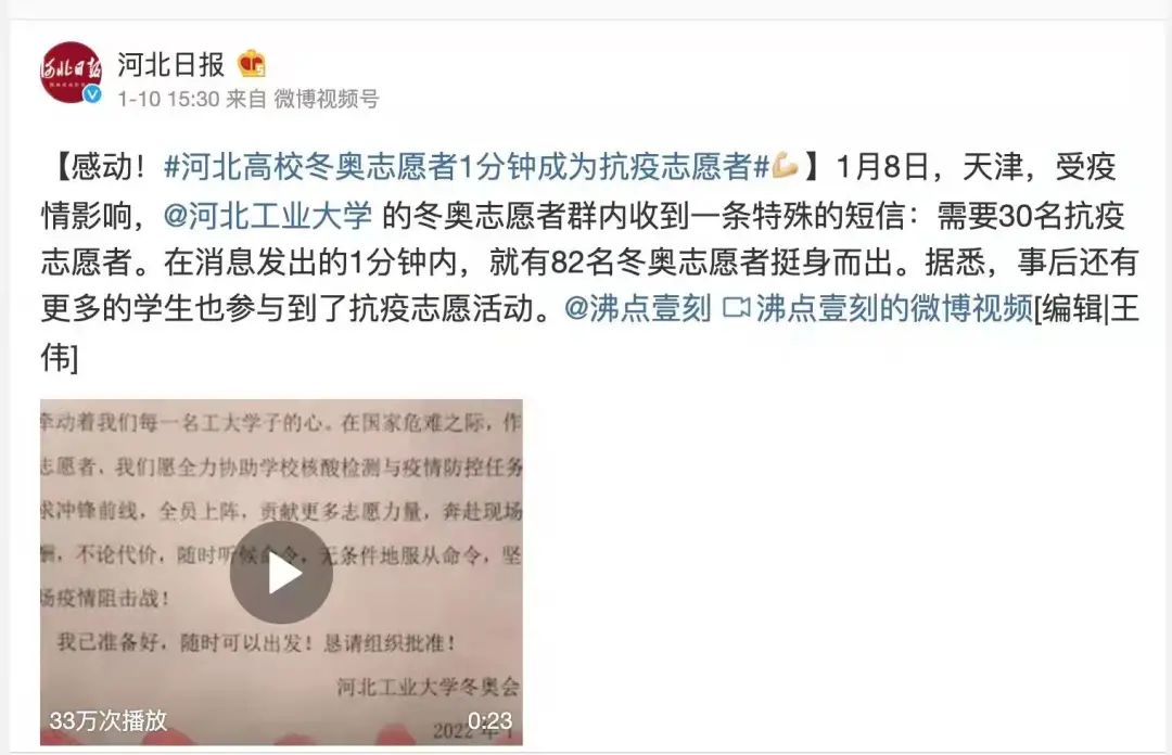 近日,一場與疫情的戰斗在天津打響。關鍵時刻,沖鋒在前,我校冬奧志愿者挺身而出,爭先報名抗疫志愿者,青春抗疫事跡受到多家主流媒體關注。新華社、人民日報、人民網、光明日報、學習強國學習平臺、中國青年報、中國青年志愿者、中華全國學聯、北京青年報、河北日報、揚子晚報、津彩青春、青春河北等主流媒體相繼予以專題報道30余次,全網視頻播放量約755.5萬次,其中新華社單篇報道閱讀量約111.7萬次。