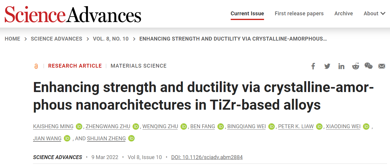 近日,河北工業(yè)大學(xué)原子尺度研究團(tuán)隊(duì)在國(guó)際頂級(jí)學(xué)術(shù)期刊Science Advances上發(fā)表了題為“Enhancing strength and ductility via crystalline-amorphousnanoarchitectures in TiZr-based alloys”的研究論文,揭示了納米尺度晶體-非晶三維雙聯(lián)續(xù)結(jié)構(gòu)有助于改善材料強(qiáng)度和塑性的固有矛盾,實(shí)現(xiàn)材料強(qiáng)度和塑性的同時(shí)提升。論文的第一作者為河北工業(yè)大學(xué)材料學(xué)院明開勝副教授,中科院金屬所朱正旺研究員為共同一作,通訊作者為河北工業(yè)大學(xué)鄭士建教授、內(nèi)布拉斯加大學(xué)林肯分校王健教授和北京大學(xué)韋小丁教授。論文第一通訊單位為省部共建電工裝備可靠性與智能化國(guó)家重點(diǎn)實(shí)驗(yàn)室/材料科學(xué)與工程學(xué)院。