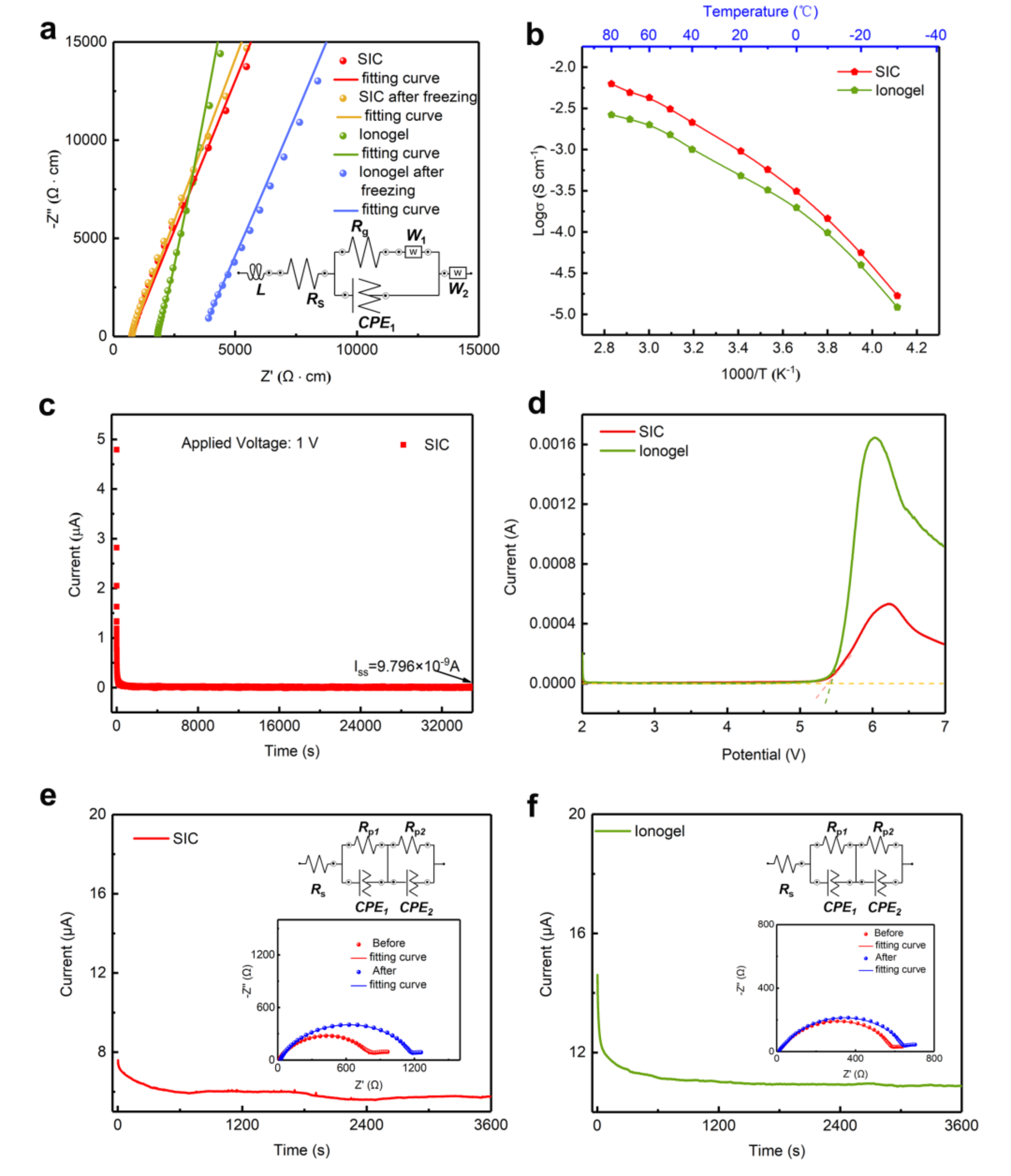 (d) SIC電解質和高濃度離子凝膠的線性掃描伏曲線.(e) SIC電解質對稱電池的電流時間-曲線.(f) 高濃度離子凝膠的對稱電池的電流時間-曲線.