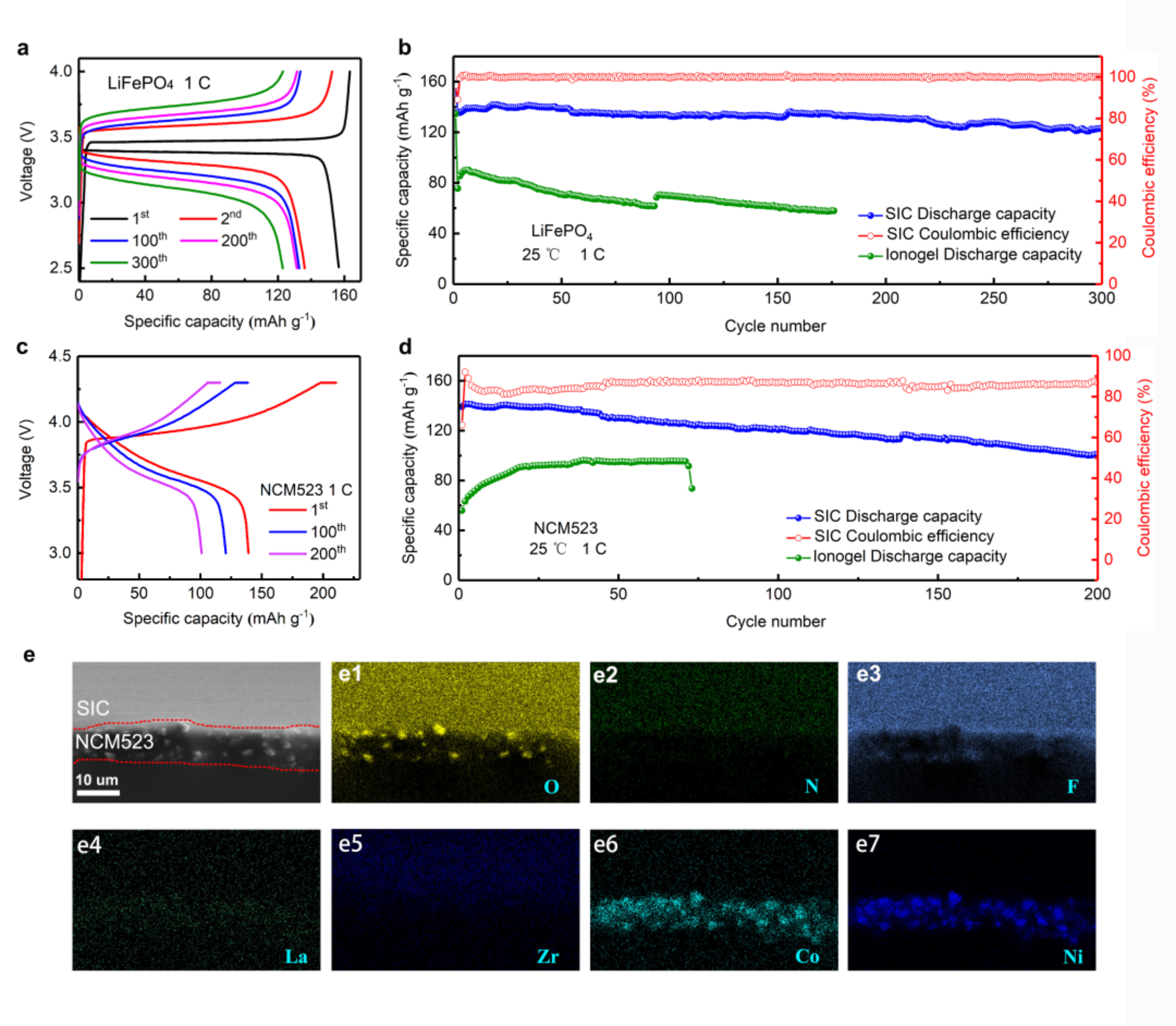 通過液相前驅體的原位聚合形成復合電解質,可以解決電解質和電極之間的高界面電阻問題。研究團隊利用陶瓷和超濃縮離子凝膠的優點,包括良好的鋰金屬穩定性和穩定的電解質/正極截面,組裝了Li‖NCM523和Li‖LiFePO4固態電池,Li‖LiFePO4電池在25℃,倍率為1C的條件下穩定工作300圈,且庫倫效率接近于100%。而Li‖NCM523電池在室溫和1C條件下的良好循環,表明該電解質可以與高壓(4.3V)正極材料相匹配。且從SEM圖可以看出SIC電解質與NCM523緊密結合在一起,從N和F的EDS圖中可以看出,離子凝膠浸潤在正極材料內部,從而導致低的界面電阻。因此,這種“陶瓷中高濃度離子凝膠”固態電解質為高安全、高能量密度鋰金屬電池提供了一條新的途徑。