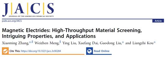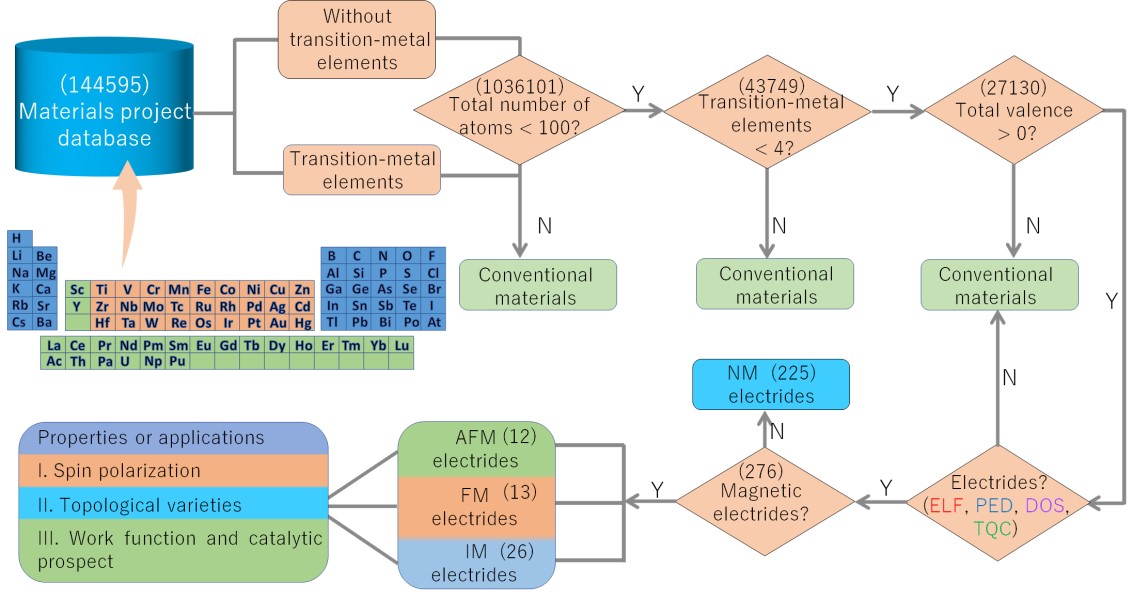 張小明教授、劉國(guó)棟教授與昆士蘭科技大學(xué)寇良志教授等,歷時(shí)近一年完成對(duì)磁性拓?fù)潆娮踊衔锏母咄坎牧虾Y選,從材料數(shù)據(jù)庫中超過14萬種材料出發(fā),結(jié)合多種判斷手段,共篩選出276種電子化合物,其中51種展現(xiàn)出鐵磁、反鐵磁與間隙磁性。此外,對(duì)所有磁性拓?fù)潆娮踊衔锏碾娮咏Y(jié)構(gòu)、拓?fù)湮镔|(zhì)態(tài)、功函數(shù)等性質(zhì)進(jìn)行了系統(tǒng)研究,并發(fā)現(xiàn)它們?cè)陔娮影l(fā)射器、促進(jìn)催化氨合成等領(lǐng)域比慣常材料具有顯著的應(yīng)用優(yōu)勢(shì)。該工作是國(guó)際上首個(gè)對(duì)磁性拓?fù)潆娮踊衔锏牟牧虾Y選、物性與應(yīng)用全方面系統(tǒng)性地研究工作,于2023年2月23日在國(guó)際頂級(jí)期刊Journal of the American Chemistry Society (DOI: 10.1021/jacs.3c00284)上在線發(fā)表。該成果第一作者為張小明教授,我校博士研究生孟維真為共同第一作者,劉國(guó)棟教授和昆士蘭科技大學(xué)寇良志教授為論文通訊作者。