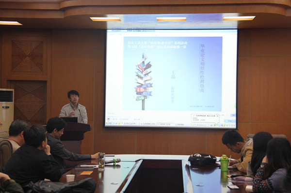 之后,圖書館副研究館員王晶作了題為《畢業論文相似性檢測指南》的講座。他結合豐富的案例,深入淺出地為與會人員詳細介紹了學術不端行為的各種表現,撰寫畢業論文資源的獲取途徑,并重點講解了論文檢測的原理、途徑及通過論文檢測報告對論文進行修改的方法,為畢業生論文撰寫和論文檢測提供了參考,也使學生對論文寫作過程中應遵守學術規范有了清醒的認識。