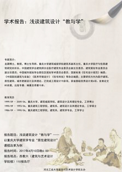 報(bào)告題目:淺談建筑設(shè)計(jì)“教與學(xué)”——以重慶大學(xué)建筑學(xué)專業(yè)“居住建筑設(shè)計(jì)”課程改革為例