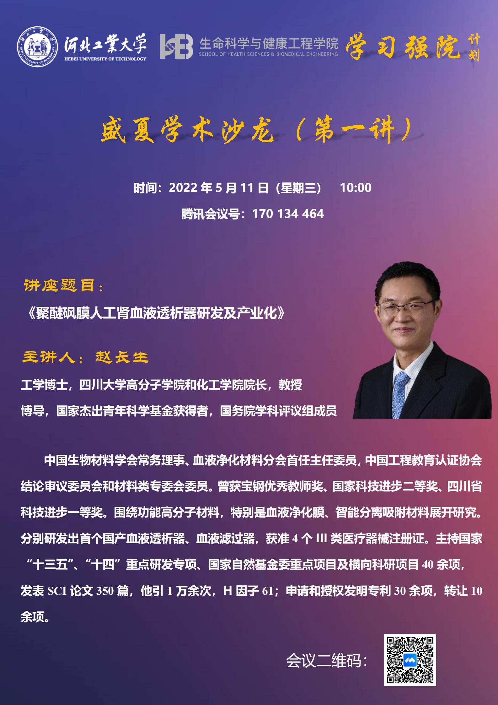 嘉賓簡(jiǎn)介:趙長(zhǎng)生,四川大學(xué)教授,博導(dǎo),享受政府特殊津貼。國(guó)務(wù)院學(xué)科評(píng)議組成員,中國(guó)生物材料學(xué)會(huì)常務(wù)理事、血液凈化材料分會(huì)首任主任委員,中國(guó)工程教育認(rèn)證協(xié)會(huì)結(jié)論審議委員會(huì)和材料類專委會(huì)委員。現(xiàn)為四川大學(xué)高分子學(xué)院和化工學(xué)院院長(zhǎng)。曾獲寶鋼優(yōu)秀教師獎(jiǎng)、國(guó)家科技進(jìn)步二等獎(jiǎng)、四川省科技進(jìn)步一等獎(jiǎng)。圍繞功能高分子材料,特別是血液凈化膜、智能分離吸附材料展開研究。分別研發(fā)出首個(gè)國(guó)產(chǎn)血液透析器、血液濾過器,獲準(zhǔn)4個(gè)III類醫(yī)療器械注冊(cè)證。主持國(guó)家“十三五”、“十四”重點(diǎn)研發(fā)專項(xiàng)、國(guó)家自然科學(xué)基金委重點(diǎn)項(xiàng)目、杰出青年科學(xué)基金項(xiàng)目和面上項(xiàng)目,及橫向科研項(xiàng)目40余項(xiàng),在Nature Biomedical Engineering, Progress in Materials Science, Advanced Materials等期刊發(fā)表SCI論文350篇,他引1萬余次,H因子61;申請(qǐng)和授權(quán)發(fā)明專利30余項(xiàng),轉(zhuǎn)讓10余項(xiàng)。