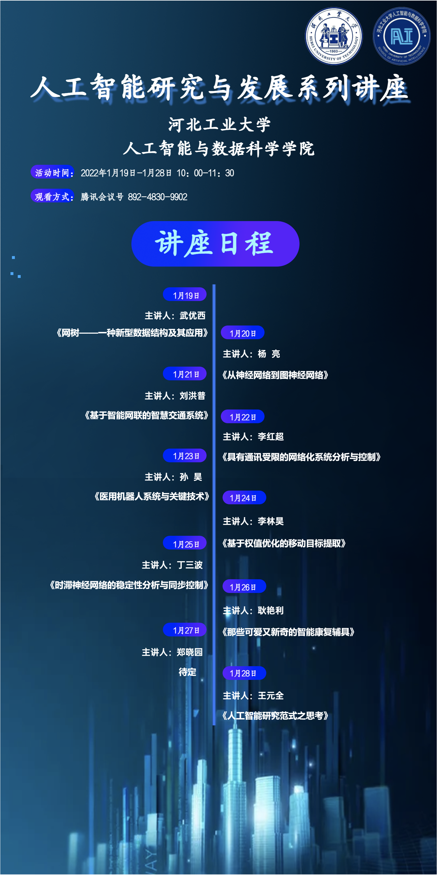 2022年寒假期間,智能學(xué)院師生以做好自身本職工作支持“抗疫行動(dòng)”。為了豐富留校研究生的科研生活,擴(kuò)大師生的科研視野,學(xué)院組織由多名“元光學(xué)者”組成的中青年骨干教師,為全校師生帶來了“人工智能研究與發(fā)展系列講座”。講座內(nèi)容包括智能康復(fù)、醫(yī)療機(jī)器人、智能交通、神經(jīng)網(wǎng)絡(luò)與復(fù)雜系統(tǒng)控制、新型大數(shù)據(jù)技術(shù)等多個(gè)人工智能前沿領(lǐng)域。歡迎廣大師生參加。