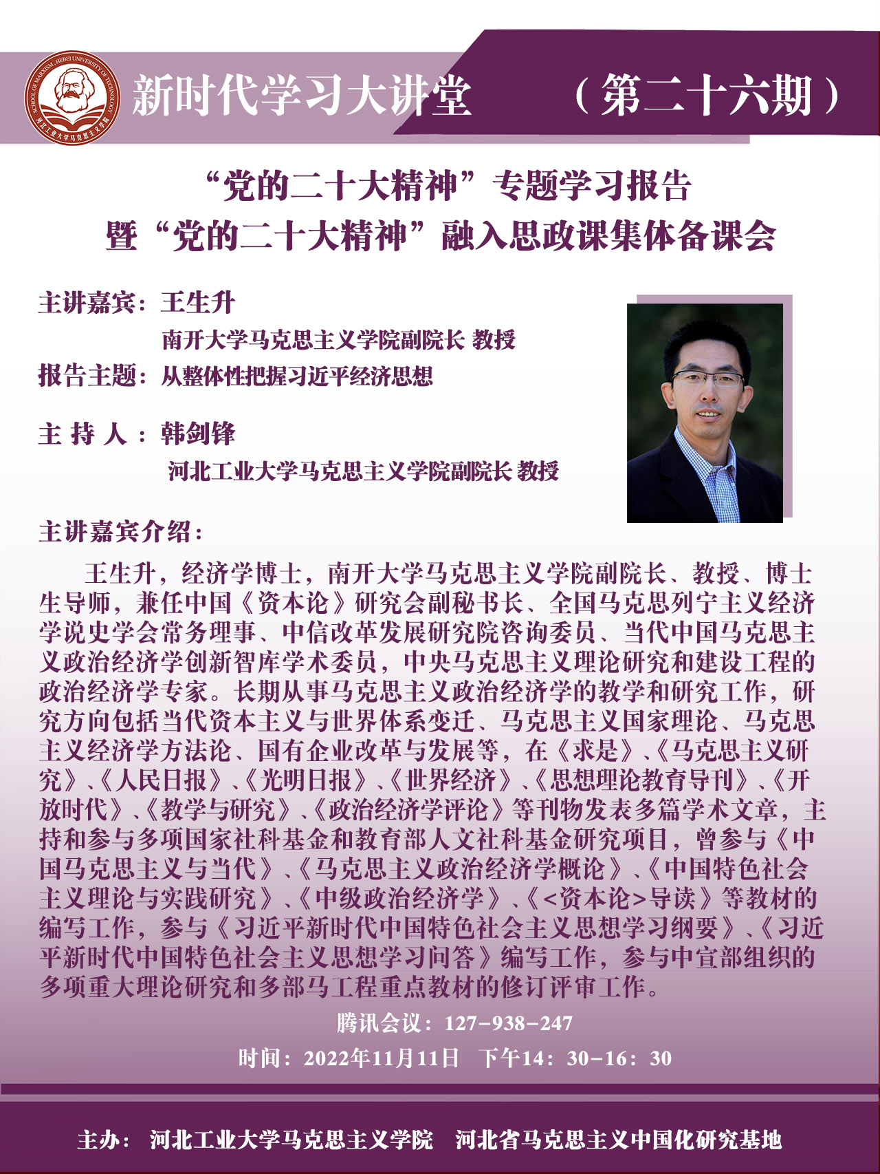 講座題目:“黨的二十大精神”專題學(xué)習(xí)報(bào)告暨“黨的二十大精神”融入思政課集體備課會(huì)——從整體性把握習(xí)近平經(jīng)濟(jì)思想