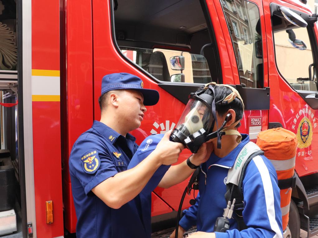 理論講解結束后,新生們列隊參與了消防裝備體驗環節。新生們有序來到消防裝備展示區,近距離參觀專業救援車輛。消防官兵打開車廂逐一介紹各類裝備的功能用途,部分新生代表親身參與裝備體驗,親手觸摸消防水帶、破拆工具等專業器材,嘗試佩戴過濾式綜合防毒面具、穿戴滅火防護服,真切感受消防裝備的專業性與實用性。